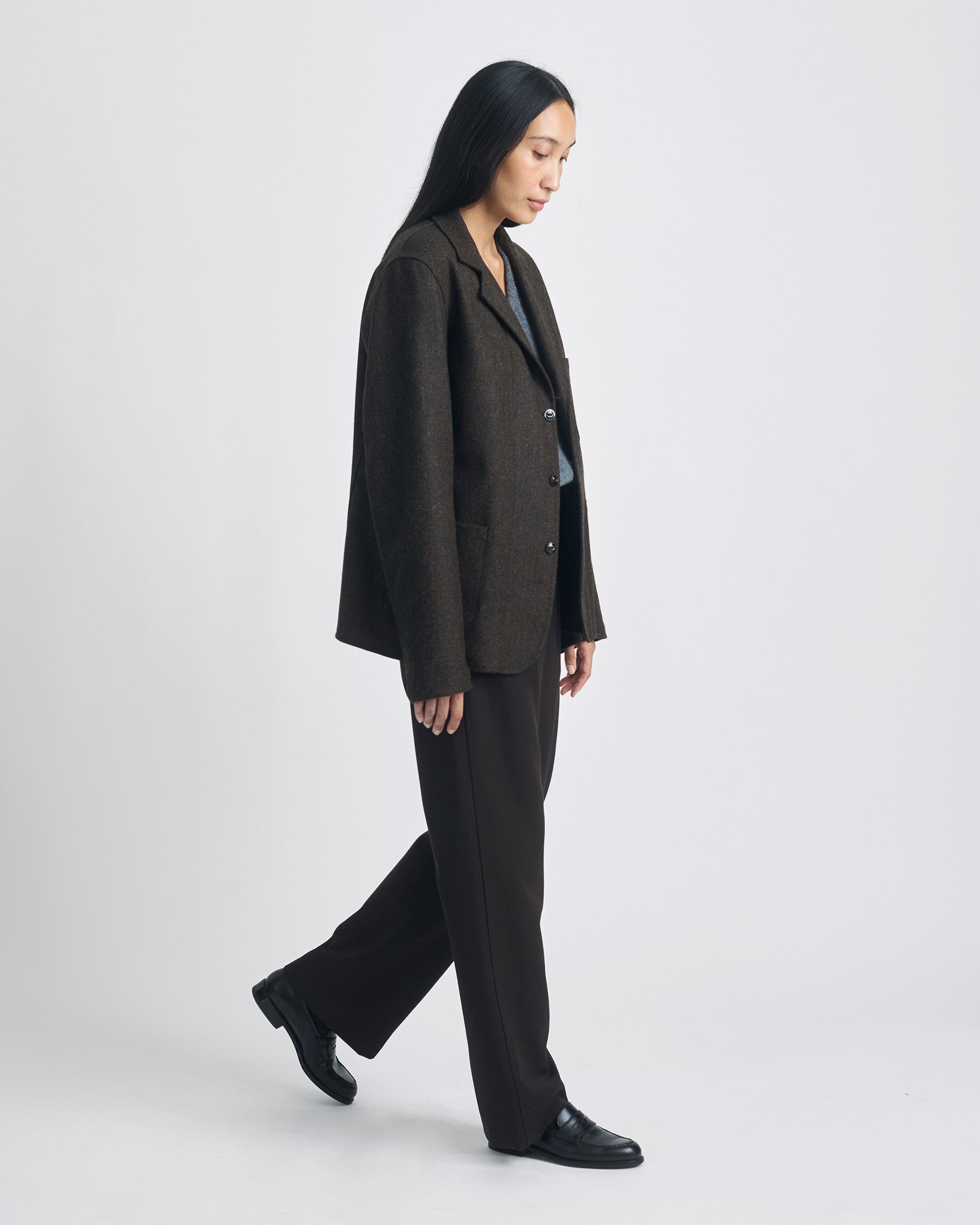 A refined interpretation of a 1940s naval trouser, tailored specifically for a women’s fit. Cut from a densely rich, drapey wool gabardine milled in Veneto, Italy, these trousers combine the structure of traditional utility garments with the languid elegance of more formal menswear.