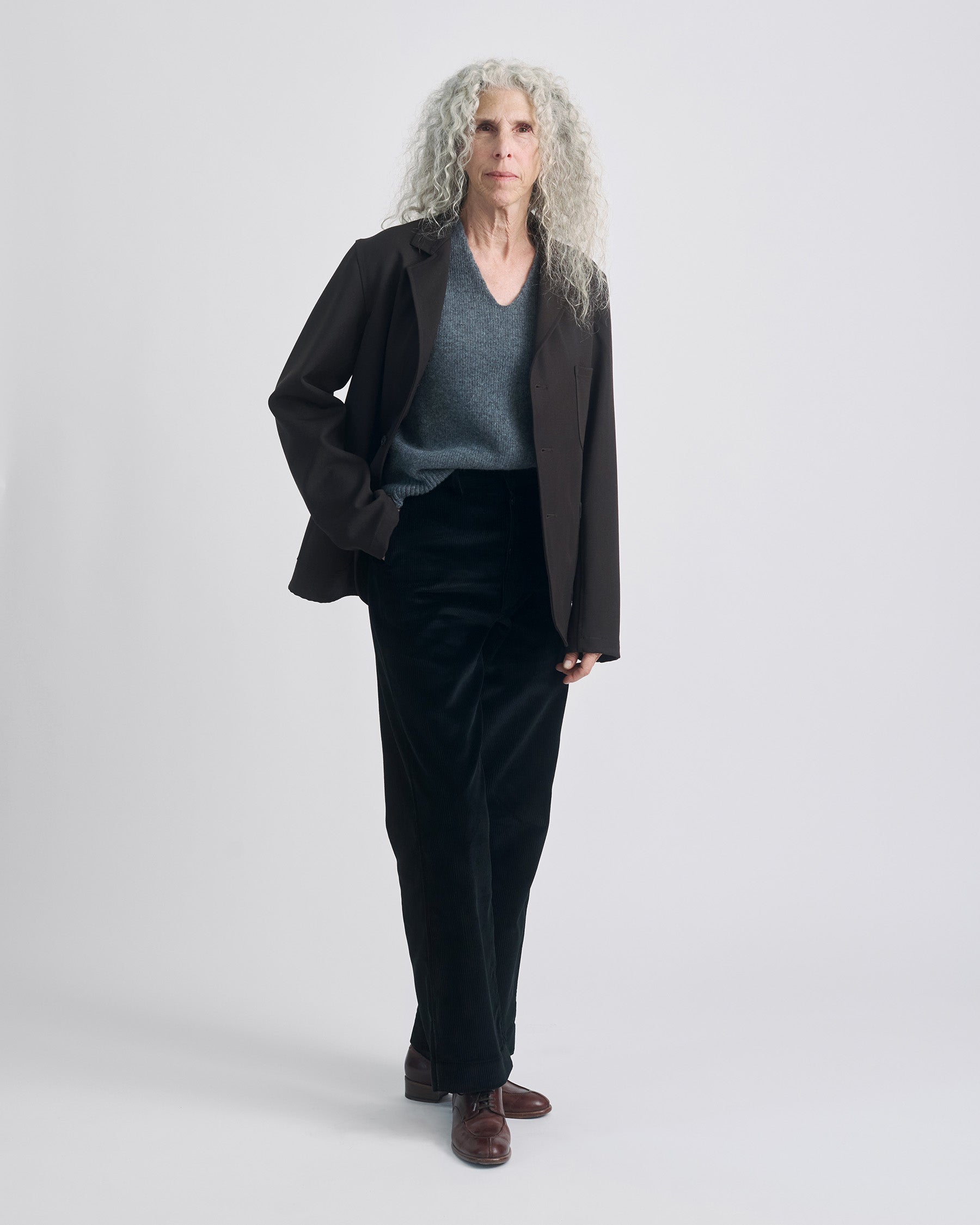 A sturdy, refined trouser inspired by 1940s naval workwear, tailored specifically for a women’s fit. Recut here in a beautifully textured black 8-wale corduroy with a deep, velvety finish. The wide wale lends a subtle sheen and structure, balancing the weight of utility with ease of movement and comfort.